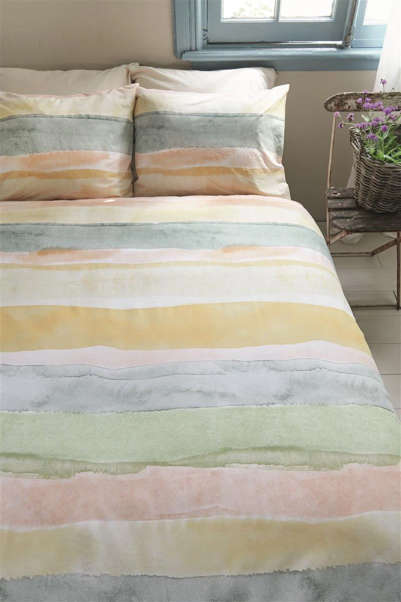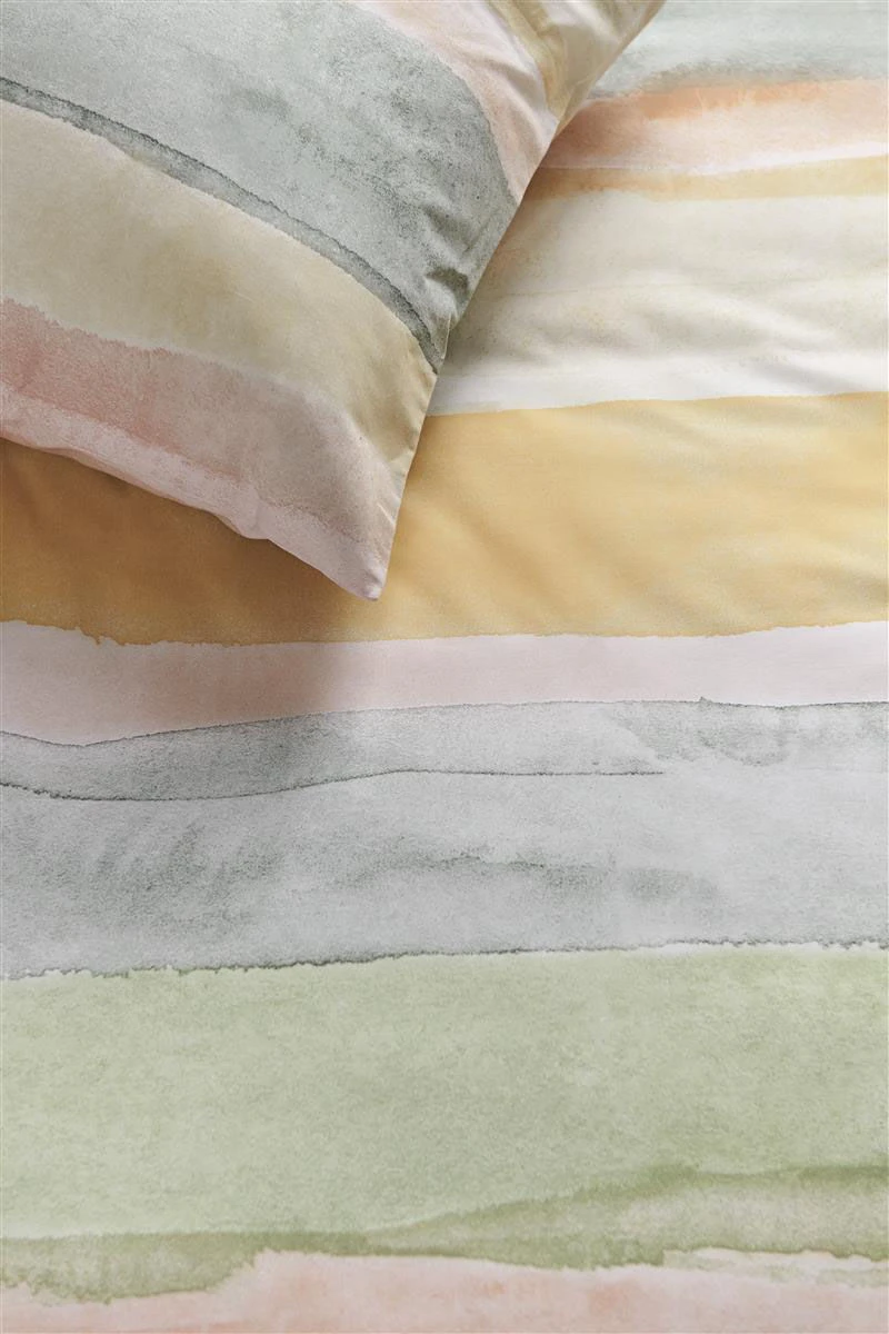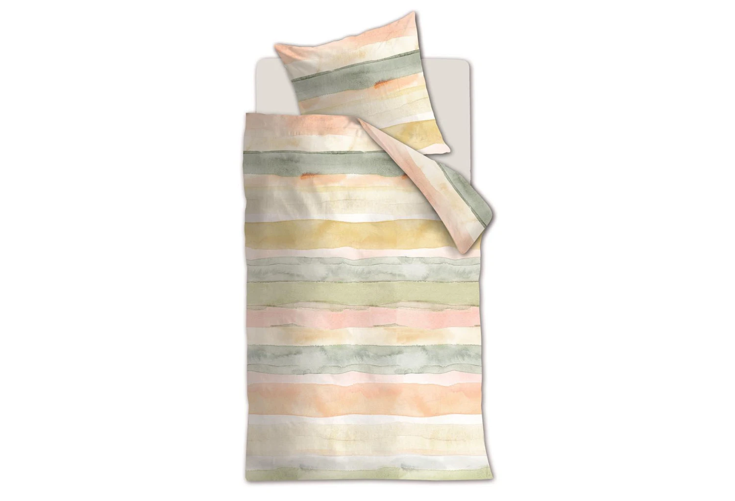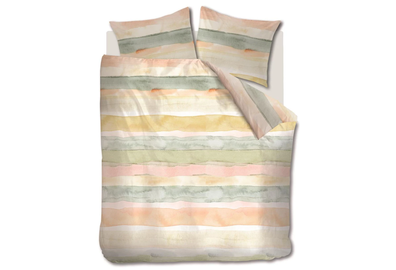 Auf dem Bettbezug Mix von Ariadne at Home finden wir einen Druck mit exquisiten handgemalten Aquarellstreifen. Verschiedene Rosatöne werden mit Grün-, Weiß-, Grau-Grün-, Sand- und Ocker-Tönen kombiniert. Sowohl die Vorder- und Rückseite des Bezuges als auch die Kissenbezüge sind mit demselben Muster bedruckt.