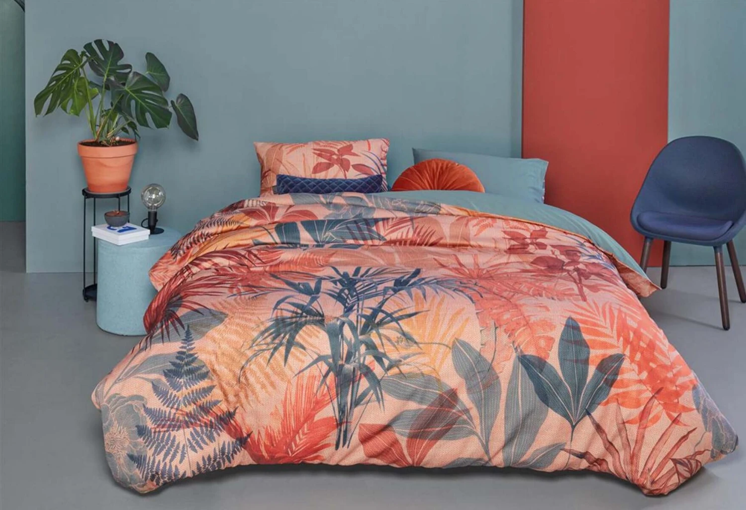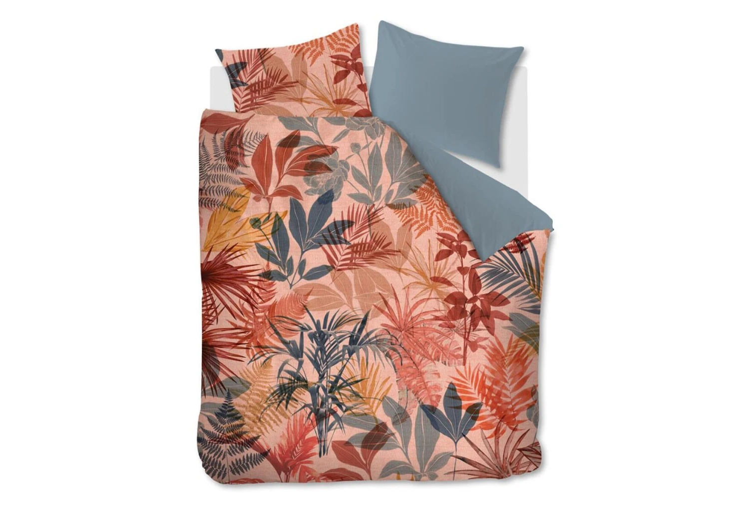 Botanische Blätter zieren die moderne Bettwäsche Daintree Rot. Der Bettbezug hat einen hellroten Untergrund, auf dem sich warme, dunkelrote Blätter und als Akzent dazu blaue Blätter befinden. Die Rückseite des Bettbezugs ist einfarbig blau. Durch den Glanz des Satingewebes sieht die Bettwäsche besonders elegant aus. Sie fühlt sich zudem herrlich weich und glatt an. Beddinghouse möchte ansprechende Kollektionen im Einklang mit Mensch und Umwelt entwerfen. Daher ist Beddinghouse Mitglied des Programms Better Cotton Initiative, mit dem das Ziel verfolgt wird, die Produktion von Baumwolle weltweit zu verbessern. Die Bettwäsche ist aus Mako-Satin, reine Baumwolle 220 TC, gefertigt. Der Bettbezug hat einen edlen Glanz und fühlt sich durch die Satinbindung glatt an. Bei einer Satinbindung werden mehr Fäden verwendet – das Gewebe wird dichter. Mako-Satin besteht aus hochwertiger reiner Baumwolle, ist atmungsaktiv und feuchtigkeitsabsorbierend. Der Bettbezug ist mit einem Reißverschluss ausgestattet.