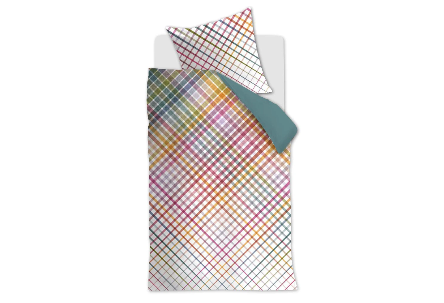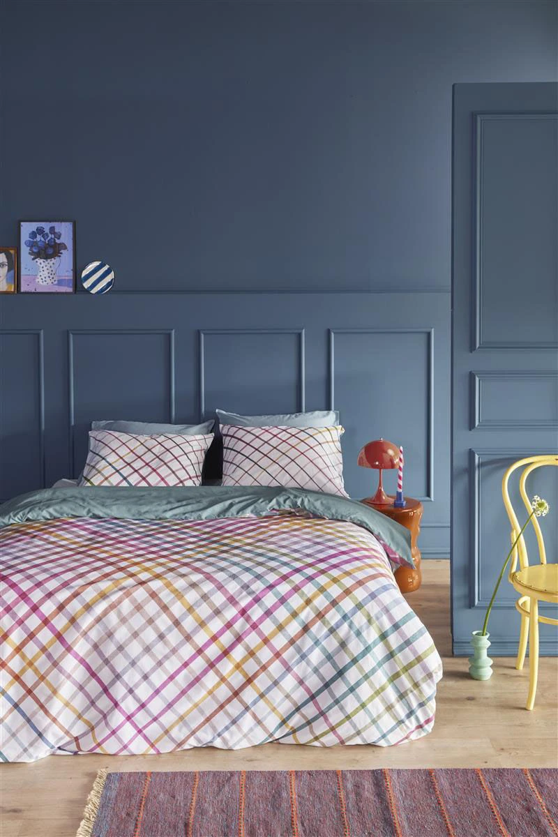 Der Bettbezug Rosie von Beddinghouse hat ein lebhaftes, extravagantes Karomuster. Die diagonalen farbigen Streifen, aus denen das Karomuster besteht, stellen alle Farben des Regenbogens dar. Der weiße Hintergrund hat eine gewebte Textur. Der Bettbezug hat eine einfarbig blaue Rückseite. Der Bettbezug hat durch die Satinbindung einen schicken Glanz.