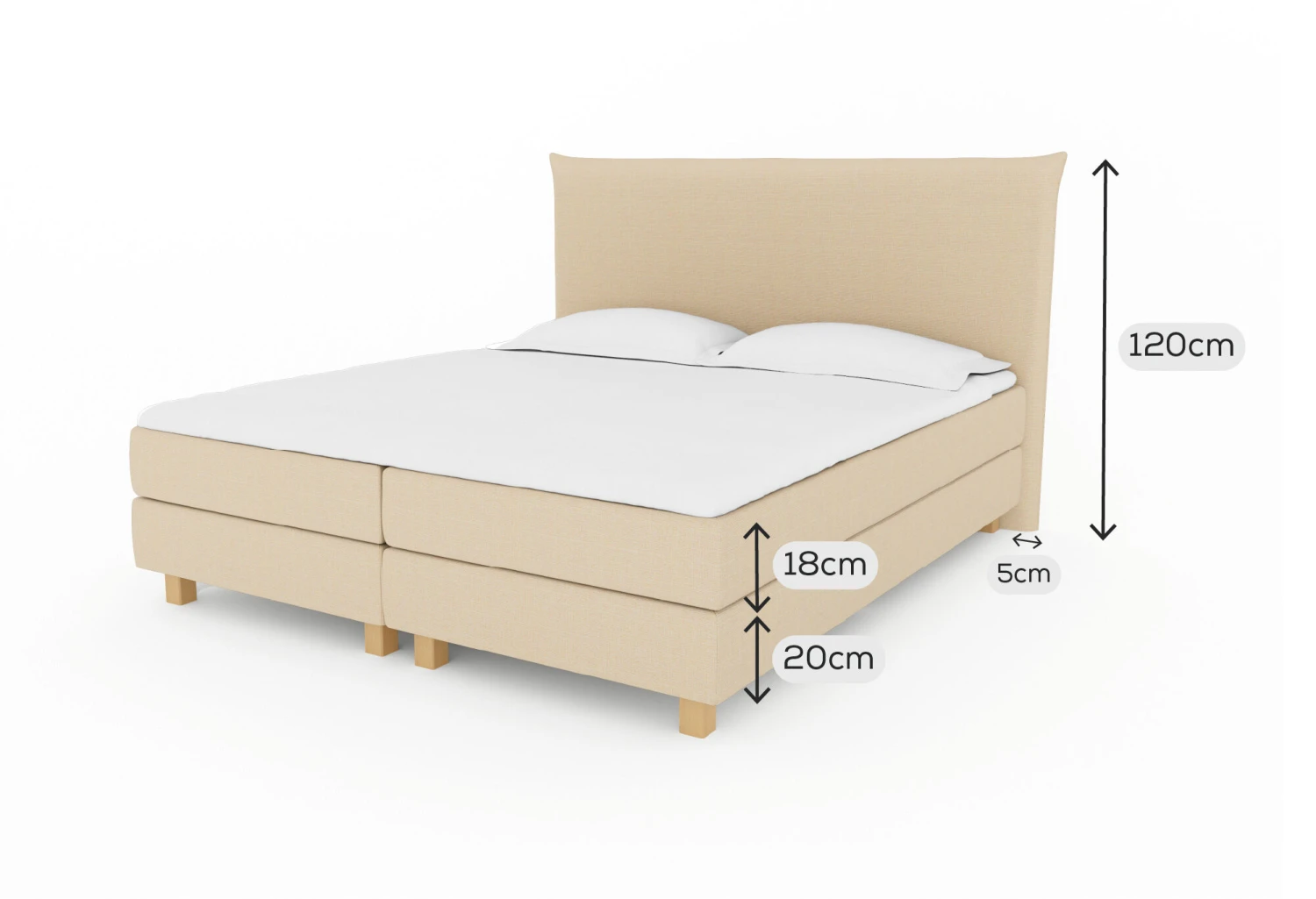 | Kopfteilbreite | steht auf beiden Seiten des Betts 5 cm über |