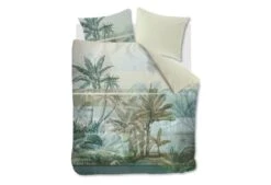 Das Dessin der Bettwäsche Canopy kombiniert auf für Beddinghouse charakteristische Weise verschiedene Arten von tropischen Blättern und Pflanzen in hellem und dunklem Grün. Das Bild ist von mehreren Streifen durchzogen, die eine subtile Veränderung des Farbverlaufs von Hellblau zu Petrol sichtbar machen. Für einen verspielten Effekt sorgt ein gelber Akzent. Das Dessin ist vom Trend des Botanik-Looks inspiriert. Allerdings ist es etwas sanfter und verspielter, wie man es aus der Mode kennt. Durch das besondere Satingewebe fühlt sich die Bettwäsche wunderbar weich an. Der Glanz des Satins verleiht der Bettwäsche eine schicke Note. Die Rückseite des Bettbezugs ist einfarbig grün. Die Bettwäsche ist aus Mako-Satin, reine Baumwolle 220 TC, gefertigt. Der Bettbezug hat einen edlen Glanz und fühlt sich durch die Satinbindung glatt an. Bei einer Satinbindung werden mehr Fäden verwendet – das Gewebe wird dichter. Mako-Satin besteht aus hochwertiger reiner Baumwolle, ist atmungsaktiv und feuchtigkeitsabsorbierend. Der Bettbezug ist mit einem Reißverschluss ausgestattet.