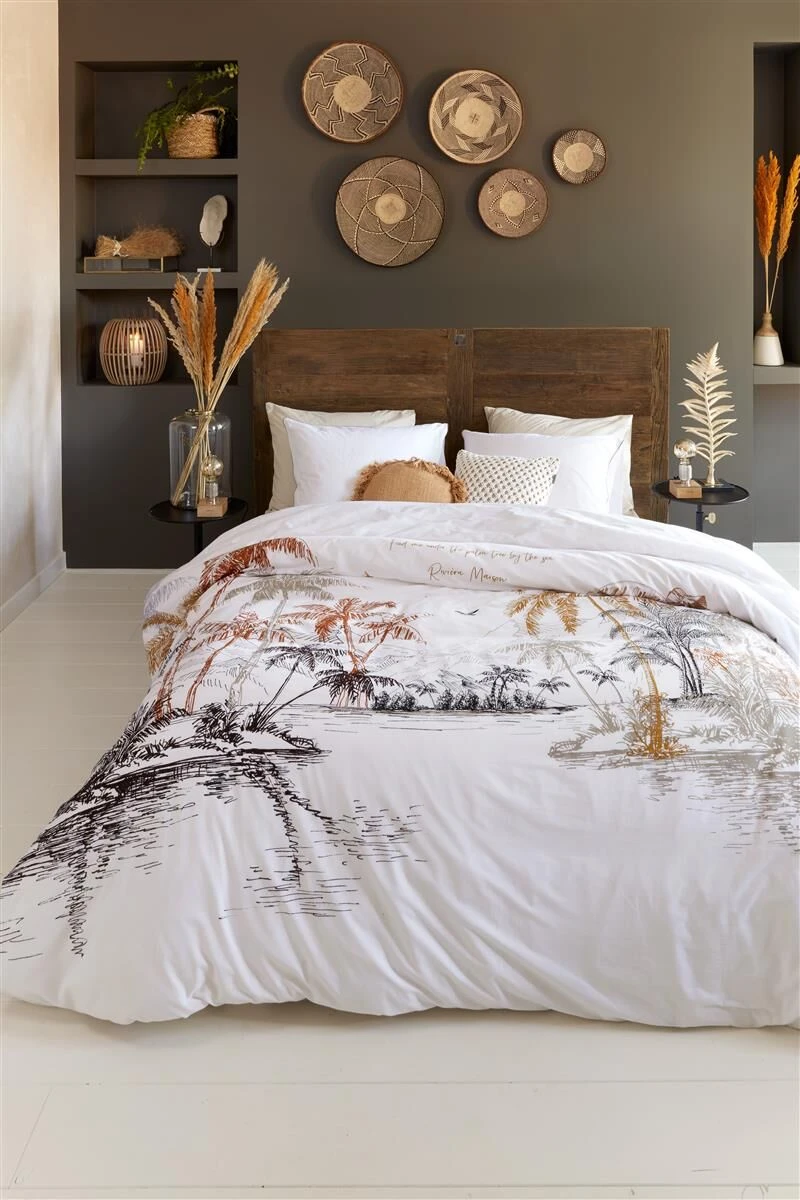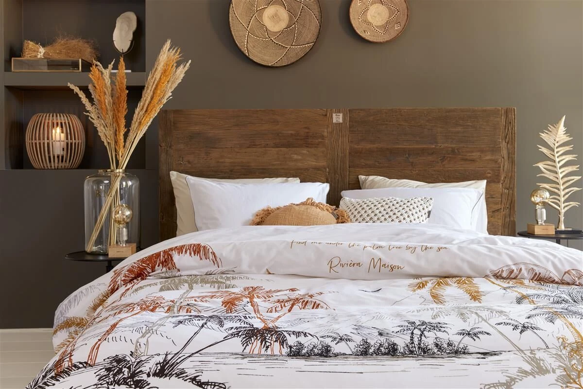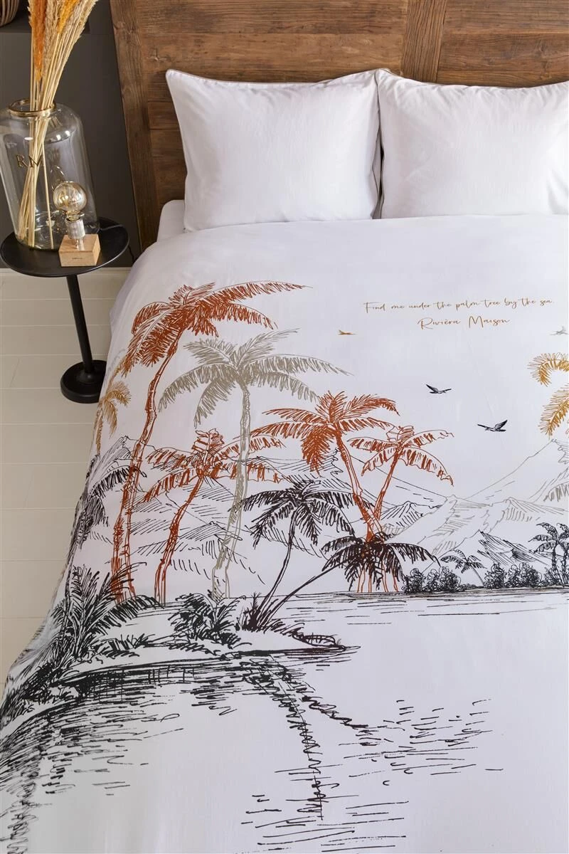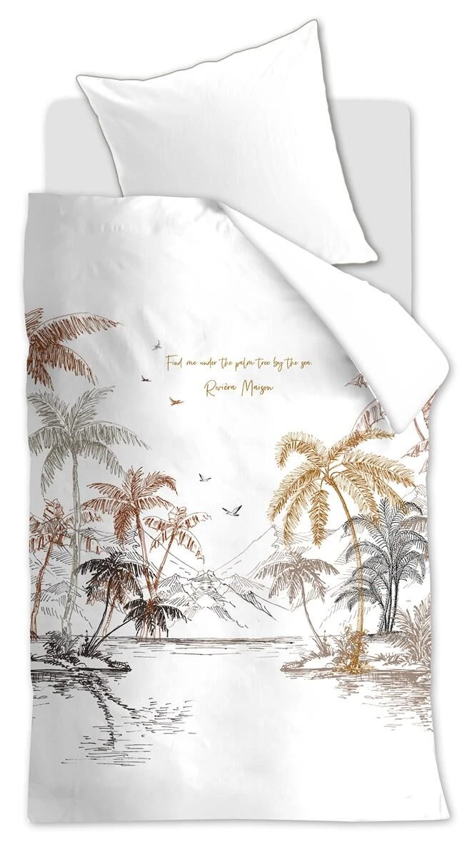 Auf der Bettwäsche Palawan sind Palmen in den warmen Farben Terra, Ocker, Grau, Taupe, Sand und Schwarz auf einem weißen Hintergrund abgebildet. Über den Palmen prangt der Text „Find me under the palm tree by the sea“, mit darunter „Rivièra Maison“. Der Kissenbezug ist rundum mit einer taupefarbenen Einfassung versehen. Die Bettwäsche ist aus hochwertiger reiner Baumwolle gefertigt. Der Bettbezug ist mit einem Reißverschluss ausgestattet. Die Bettwäsche ist bis 60 Grad waschbar, trocknergeeignet und kann gebügelt werden.