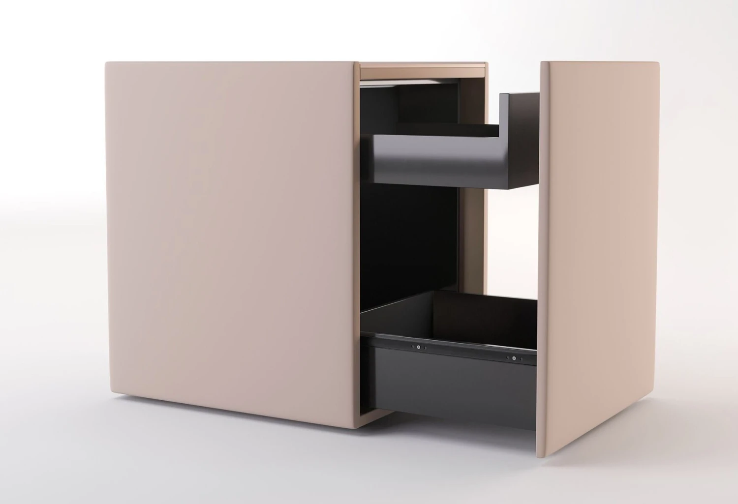 Die gesamte Vorderseite dieses Nachttischs besteht aus einer gepolsterten Schubladenfront mit einer großen Schublade. Hinter dieser Front befindet sich eine zweite, zusätzliche Schublade, die mit einem Push-to-Open-System ausgestattet ist. Ein leichter Druck auf diese Schublade bewirkt das Öffnen der Schublade, sodass bei diesem Nachttisch keine Handgriffe benötigt werden