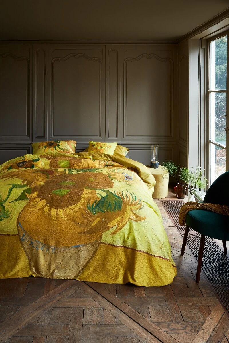 Die „Sonnenblumen“ sind weltweit eines der bekanntesten Werke van Goghs. Eine reiche Sinfonie verschiedener Gelb-, Orange- und Grüntöne. Mit dieser Serie dekorativer Sonnenblumen-Stillleben wollte van Gogh Eindruck auf seinen Freund Paul Gauguin machen. Van Gogh machte sich mit großem Fanatismus an diese Serie. Er musste schnell malen, weil die Blumen in einer Vase schnell verwelken: „Ich male jetzt mit demselben wütenden Eifer, mit dem ein Marseiller seine Bouillabaisse [provenzalische Fischsuppe] verzehrt. Das wird dich nicht wundern, wenn du hörst, dass ich große Sonnenblumen male.“ Gauguin fand die Gemälde tatsächlich äußerst gelungen und meinte, dass die Sonnenblumen für van Gogh eine charakteristische Handelsmarke seien. 1889 nahm van Gogh das Motiv neuerlich auf und schuf das Bild, das heute im Van Gogh Museum zu sehen ist. Die Bettwäsche ist aus reinem Mako-Satin gefertigt. Der Bettbezug ist mit einem Reißverschluss ausgestattet. Die Bettwäsche ist bis 60 Grad waschbar, trocknergeeignet und kann gebügelt werden.